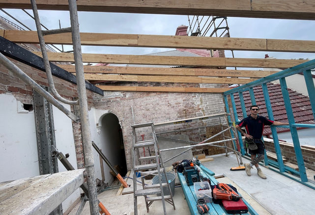 Complete knock-down and rebuild of a coastal home in South Coogee. Tom Flanders managed timber framing and roof framing on this architectural project with stunning ocean views.